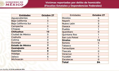 Colima, México, Avanzada (29/10/2024).- La Secretaría de Seguridad y Protección Ciudadana informó que ayer se registraron un total de 77 homicidios dolosos en todo el país....