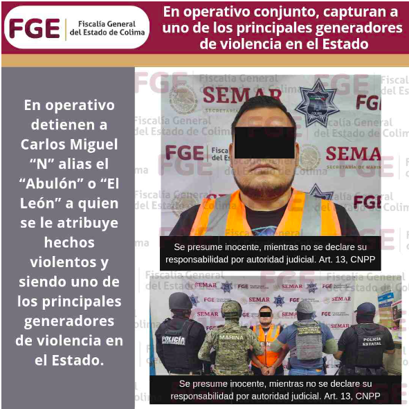 Colima, México, Comunicado (08/06/2023).- La Fiscalía General del Estado de Colima informó que fue detenido en un operativo Carlos Miguel “N” alias el “Abulón” o “El...