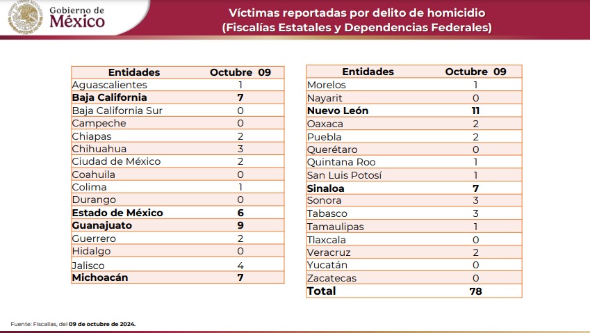 Colima, México, Avanzada (10/10/2024).- La Secretaría de Seguridad y Protección Ciudadana informó que el día de ayer se registraron un total de 78 homicidios dolosos en...