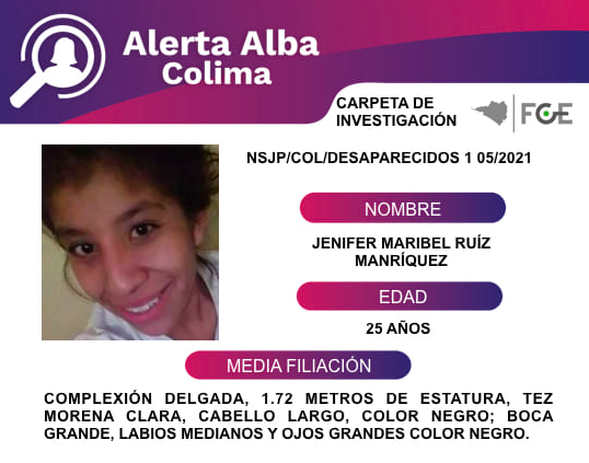 Colima, México, Avanzada (12/03/2021).- Jenifer Maribel Ruíz Manríquez desapareció el 09 de abril de 2019 al salir de su domicilio ubicado en la población de Quesería,...