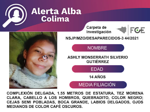 Colima, México, Avanzada (23/02/2021).- Ashly desapareció el sábado 20 de febrero de 2021, la Fiscalía de Colima activó Alerta Alba. Ashley tiene complexión delgada, mide 1.55...
