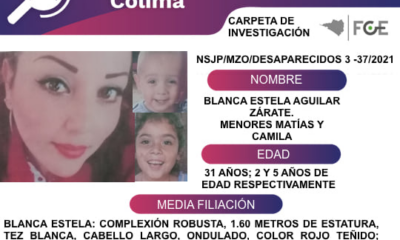 Colima, México, Avanzada (18/02/2021).- Blanca Estela Aguilar Zárate y los menores Matías y Camila tienen 31 años de edad; 2 y 5 años respectivamente, fueron vistos...